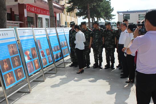 在“八一”建军节来临之际,为丰富官兵文化生活,继承和发扬革命优良传统,7月31日,积石山县博物馆开展了“送展览进军营活动”,让积石山县驻军官兵在军营内了解驻地历史,感受积石山县的传统文化魅力。首先,官兵们在讲解员的带领下观看了博物馆精心准备的6块图片展板,通过图文并茂的介绍和详细生动的解说使他们了解了积石山县悠久的历史文化和独具特色的彩陶文化。这次展出了马家窑文化、半山文化、马厂文化、齐家文化、辛店文化,讲解员生动仔细的讲解使官兵们陶醉在千年的文化之中,惊叹古人们的智慧,尤为那些精美的彩绘所深深折服。从多样精美的彩陶中体现出古人们对生活的热爱,对美好未来的期待。